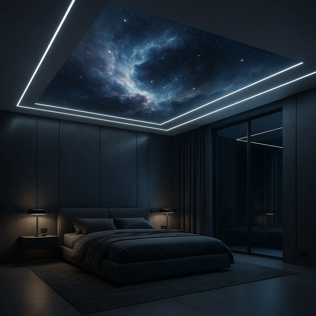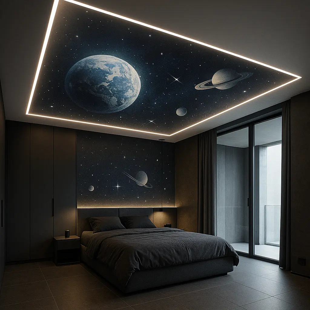 - Парящий потолок благодаря светящемуся зазору кажется парящим в воздухе, а принт добавляет глубины.