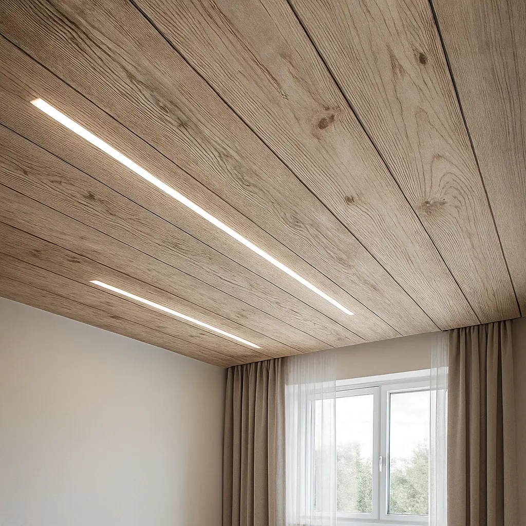 - Теневой профиль даёт чёткую границу между стеной и потолком, создавая аккуратный «тень-эффект» по периметру.